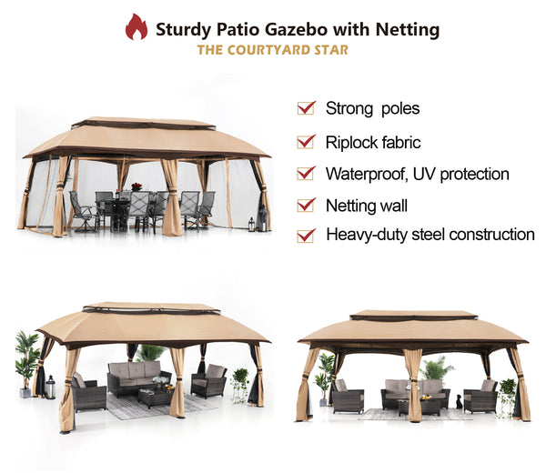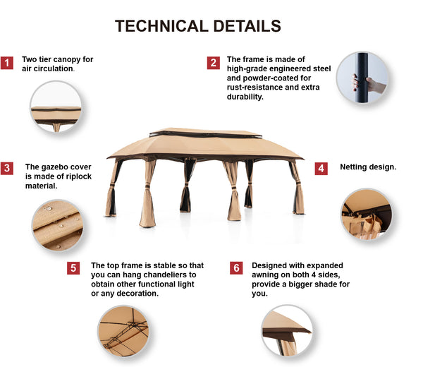 - HIGH QUALITY VENTED TOP: Our double vented roof patio gazebo, designed to enhance air circulation and strengthen wind resistance, make you feel relaxed and comfortable. Top cover is made of riplock fabric all stitching lines are sealed, waterproof, 99% UV protection and fade resistant. The drain hole at the top is designed to help drain, on rainy days, water won't collect and crush the frame.