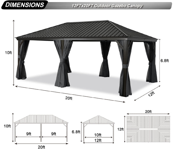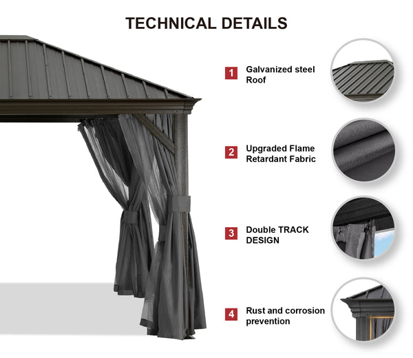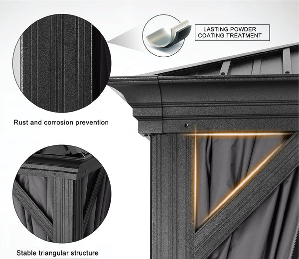 - Flame Retardant Netting & Curtains: Our permanent hardtop gazebo features built-in dual track system and comes with removable zippered curtains and netting. Netting wall keeps a safe and comfortable environment for your family and children. Waterproof and fire-resistant curtains provide additional protection, including UV rays, rain and snow, while also enhancing privacy.