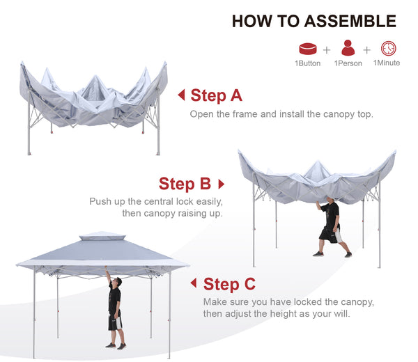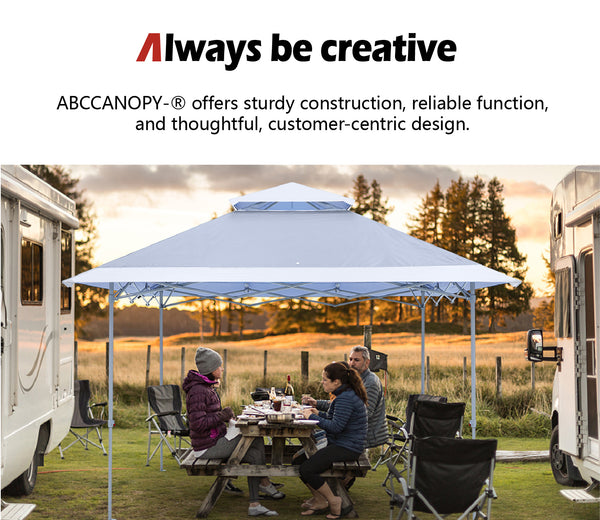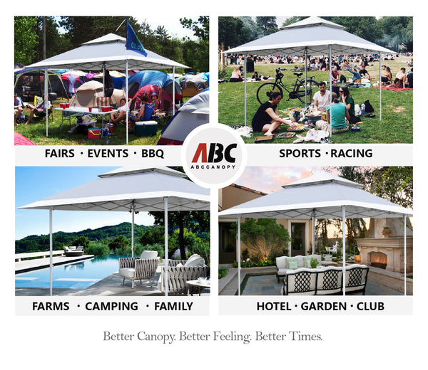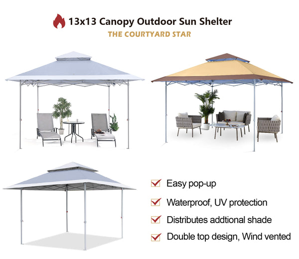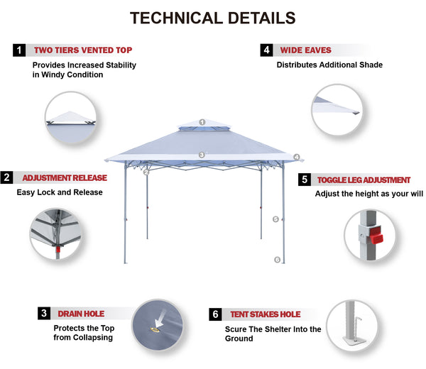 - HIGHLIGHTS AND TECHNOLOGY: 1)Double top design, wind vented, It helps to ventilate the interior of the canopy helping to release trapped heat and also provides increased stability in windy conditions by allowing the wind to pass through the vent. 2)13x13 canopy top, wide eaves, distributes addtional shade. Same money you can get more cooling shade. 3)Several drain hole is unique, keep this shelter always dry for a longer service