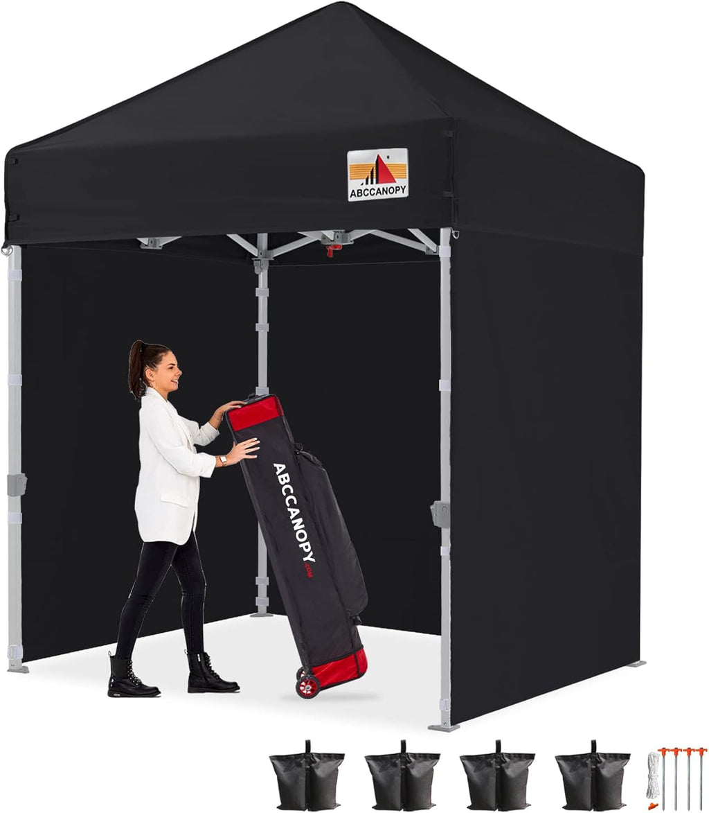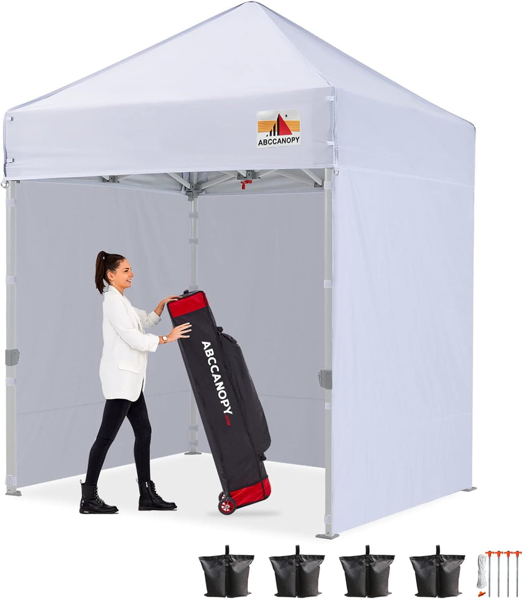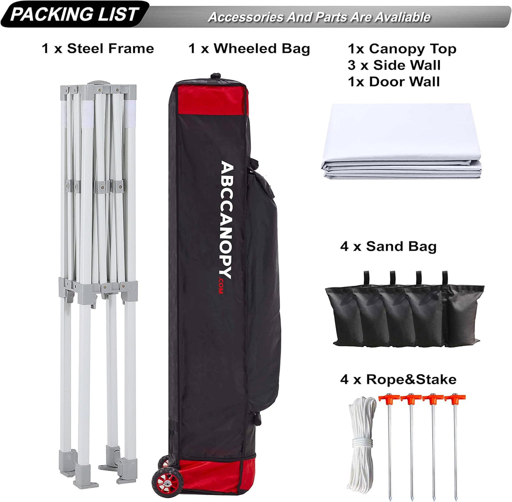 - WHAT IS INCLUDED - Commercial 5'x 5' Pop Up Canopy Frame, 5'x 5' Canopy Top Cover, 3 Removable Side Walls, 1 Door Wall. Roller Bag,4 Weight Bags, 4 stake and ropes.The upgraded style roller bag is more rugged and durable. One year after-sale protection for frame, six months after-sale protection for fabrics and accessories.