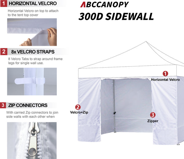 EASY, FIRM AND RELIABLE INSTALLATION: Fit securely to your canopy with Velcro Straps on top to attach to canopy trusses, 8 Velcro Tabs to strap around frame legs for single wall use. With carried Zip connectors to join side walls with each other when multiple ones use.