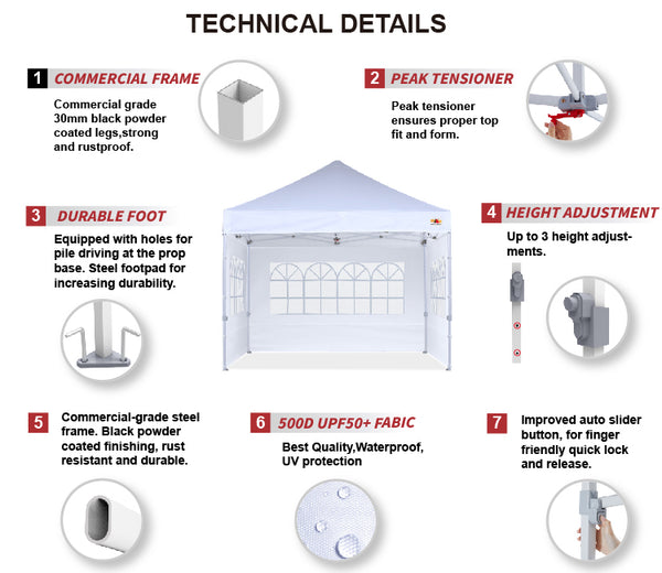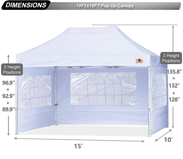 | Package Includes (8x8/8x12/10x10/10x15) | 1x Steel Frame, 1x Canopy Top, 1x Wheeled Bag 3x Windows Walls, 1x Door Wall, 4x Sand Bags, 4x Ropes & Stakes |