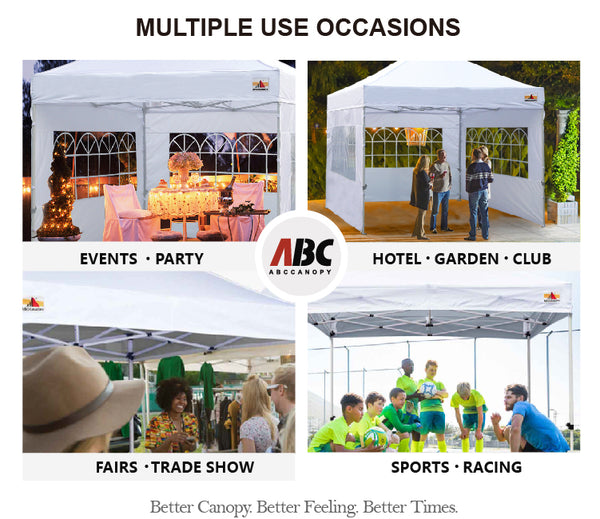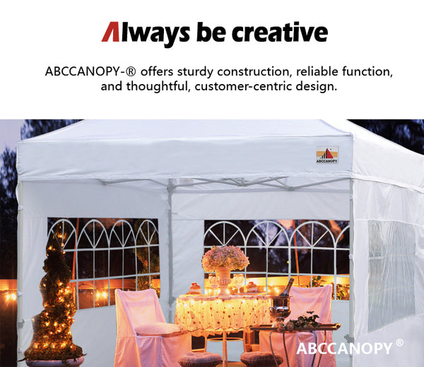- [PROFESSIONAL & SATISFACION]: ABCCANOPY is a professional canopy gazebo brand based in the USA,deeply trusted by the American people.This model designed for winter outdoor party and other activities.Bonus upgrade wheeled bag, stake and weights t bags. If you have any issue during using our products, please feel free to contact us. Accessories and parts are available for life time.