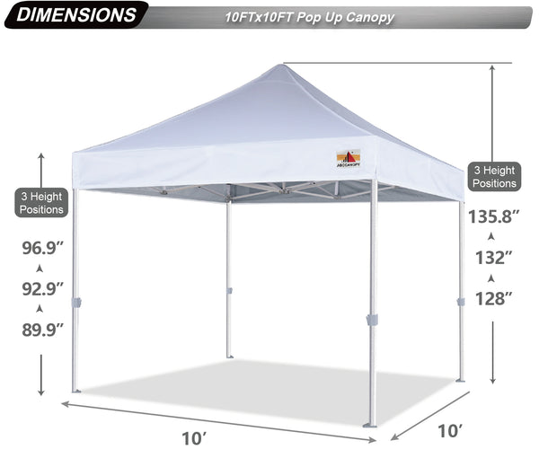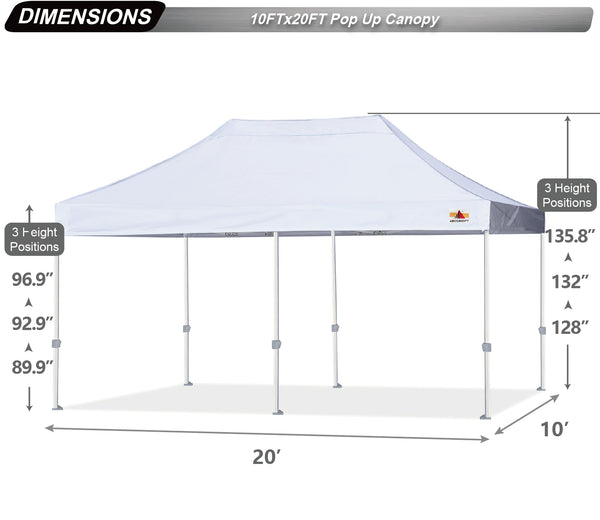 - [Easy to Set Up] No tools required, could be set up by 1 or 2 people. The latest thumb button release levers technology, makes set-up and close real safe, comfortable and reliable. Three height positions for your choice, clearance height from 6.4ft, 6.7ft to 7ft. Peak height from 10.5ft, 10.8ft to 11.1ft. Just adjust it to your expected height.