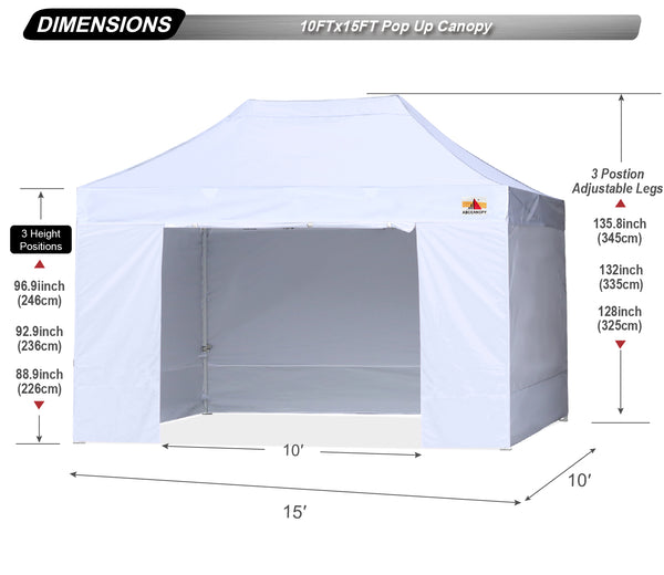 | Package Includes (10x10/10x15) | 1x Steel Frame, 1x Canopy Top, 1x Wheeled Bag 3x Side Walls, 1x Door Wall, 4x Sand Bags, 4x Ropes & Stakes |