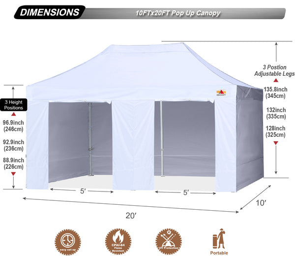 | Package Includes (10x20) | 1x Steel Frame, 1x Canopy Top, 1x Wheeled Bag 3x Side Walls, 2x Door Wall, 6x Sand Bags, 4x Ropes & Stakes |