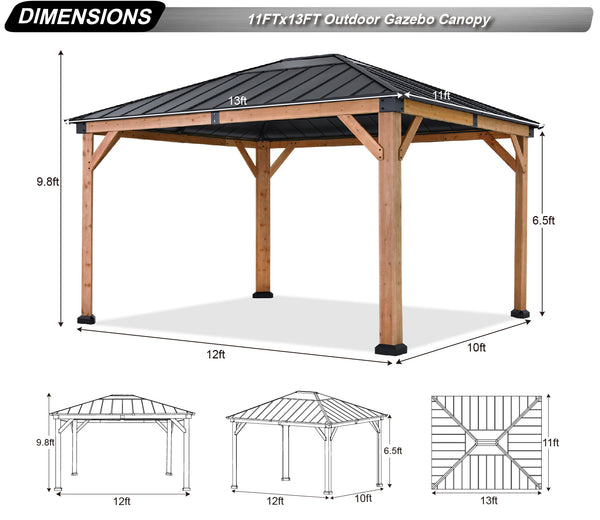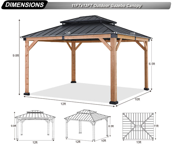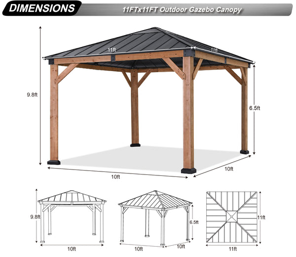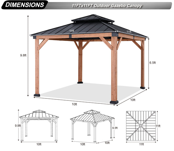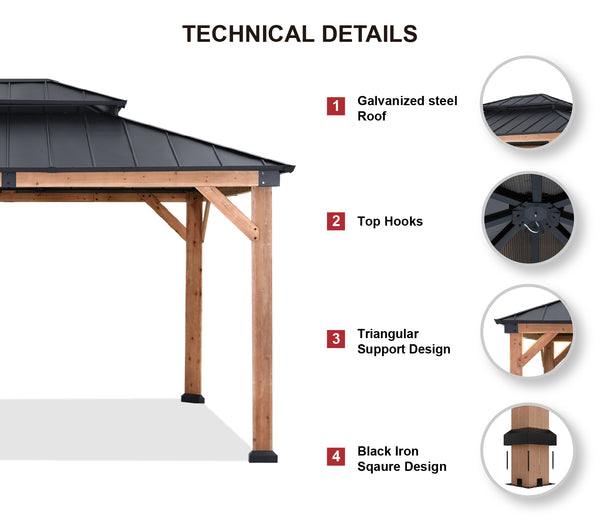 - Iron Design at the Bottom of the Legs: The outdoor wooden gazebo has a metal plate at the bottom of each leg with four holes designed to hold the stakes. A black iron block covers the bottom of each leg for aesthetic and stability. So you don't have to worry about wooden legs rotting.
