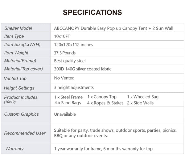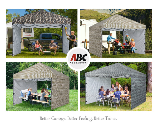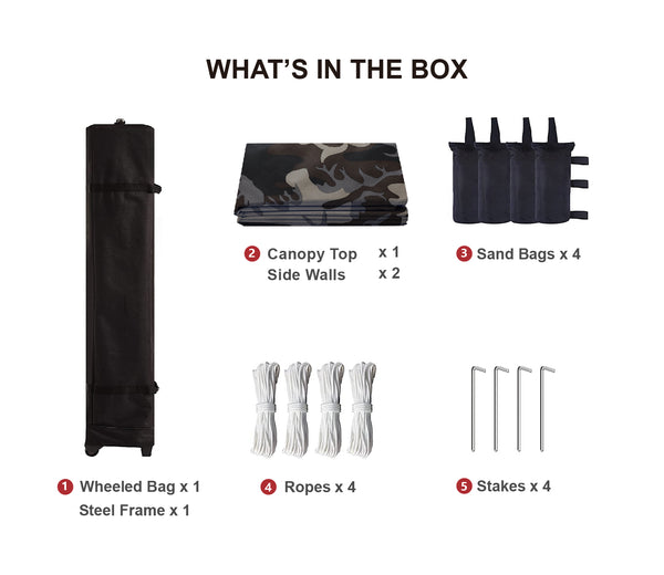 - WHAT IS INCLUDED: Commercial Pop Up Canopy Frame, Canopy Top Cover, 2 Removable Side Walls, Roller Bag,4 Weight Bags, 8 stakes and ropes.The upgraded style roller bag is more rugged and durable. One year after-sale protection for frame, six months after-sale protection for fabrics and accessories.