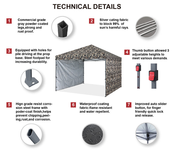 - COMMERCIAL CANOPY FRAME AND CANOPY MATERIAL: Full Truss Structure (1mm thick square shaped legs and super strong cross truss ) is commercial grade, bigger and stronger than the cheaper ones in the market, withstand trong wind. 500 Denier polyester canopy with silver coated PU lining, UPF 50+,black 99.98% UV. Heat sealed seam,latest technology in the industry, prevents water penetrate from seams, 100% waterproof. CPAI-84 fire retardant certificate.